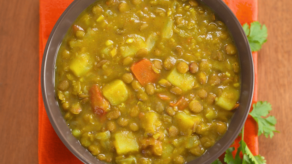 Descrição: Um prato nutritivo, reconfortante e cheio de sabor, perfeito para dias frios ou quando você quer uma refeição rápida, mas incrivelmente saborosa. Este Curry de Lentilha combina a cremosidade do leite de coco com a riqueza de especiarias como açafrão, cominho e gengibre, resultando em um prato rico em proteínas, fibras e antioxidantes. Serve bem com arroz basmati, pão naan ou quinoa!