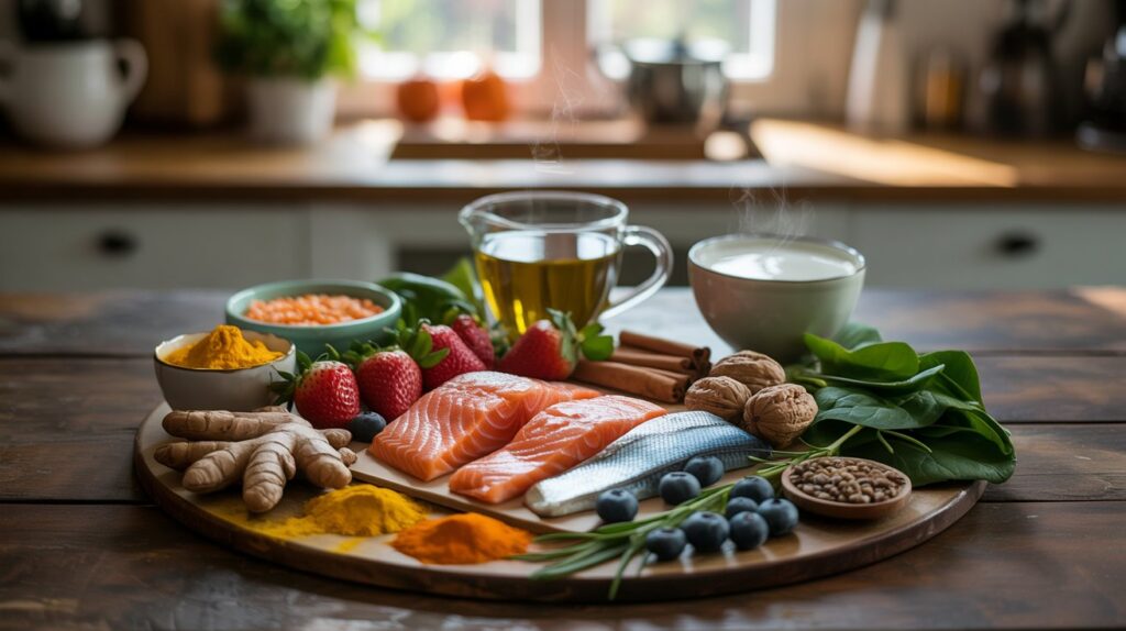 Entre os principais alimentos anti-inflamatórios estão os peixes ricos em ômega-3, como salmão e sardinha, frutas vermelhas como morangos e mirtilos, azeite de oliva extravirgem, nozes e castanhas, vegetais verdes escuros como couve e espinafre, além de especiarias como cúrcuma, gengibre e canela. Chá verde, iogurte natural e leguminosas também são grandes aliados.